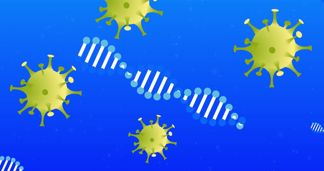 Animation featuring COVID-19 virus cells moving around a spinning DNA strand symbolizing scientific research and analysis during the global COVID-19 pandemic. Useful for educational materials, health awareness campaigns, or biotechnology presentations to highlight the intersection of genetics and viral studies.