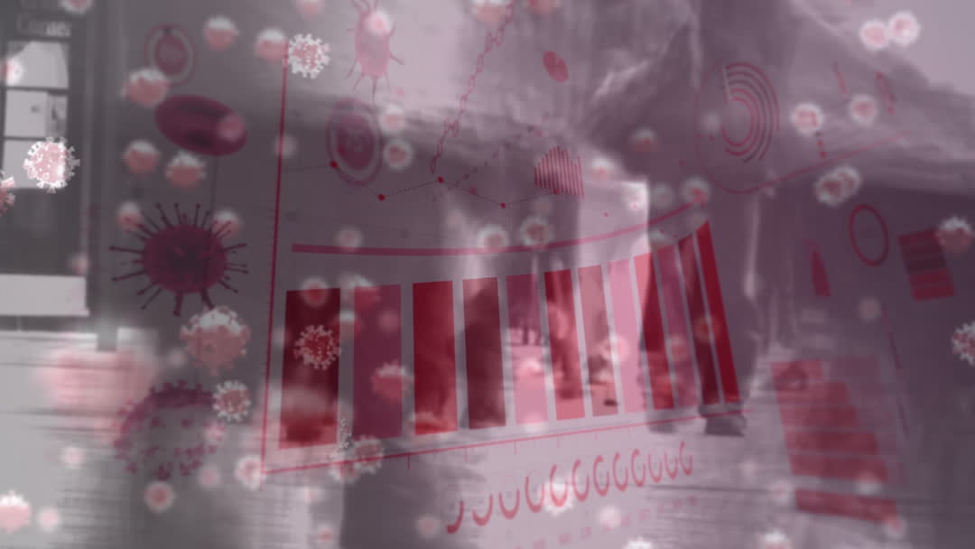 Depicts animated COVID-19 cells overlaying digital data charts. This suggests themes of global health and data analytics. Perfect for projects related to medical research, healthcare technology, or scientific data representation.