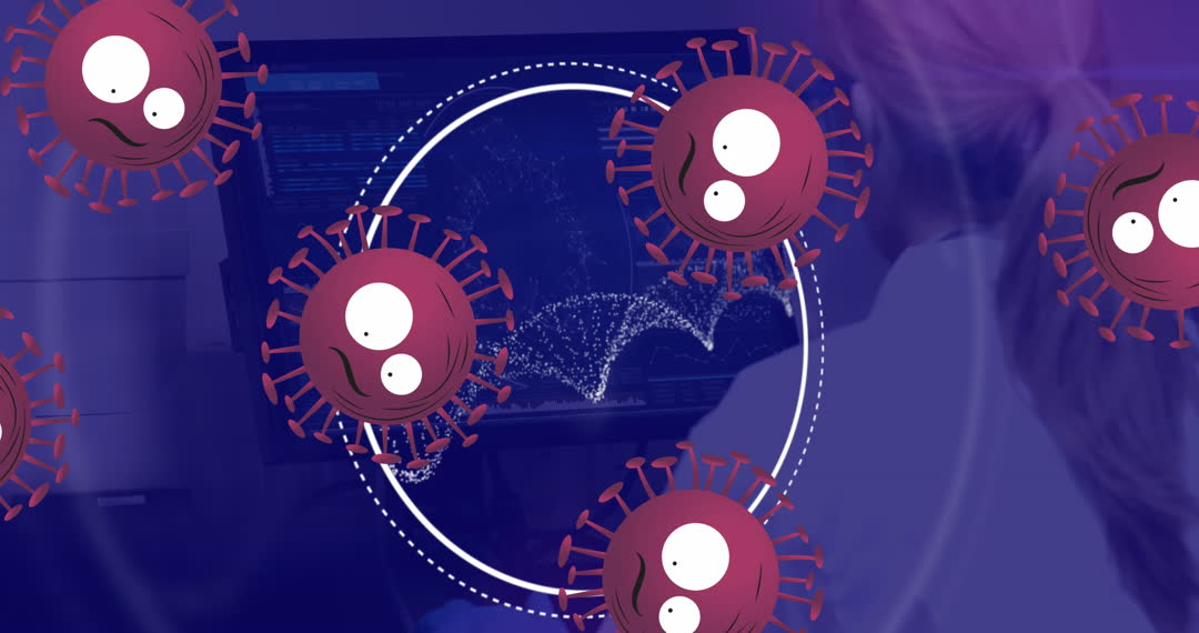 This illustration shows animated COVID-19 cells with a focus on digital DNA analysis in the background, creating a vibrant yet serious tone. Ideal for presentations, educational content on medical advancements during pandemic, and health-related publications. Useful in research contexts to explain virus behavior or genetic study processes.
