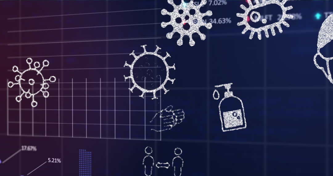 Animation displaying COVID-19 related icons superimposed over graphs and data charts signals an intersection of technology and healthcare. Suitable for media in healthcare messaging, digital technology content, educational materials or technology trend reporting visually linking pandemic data and tech innovation.