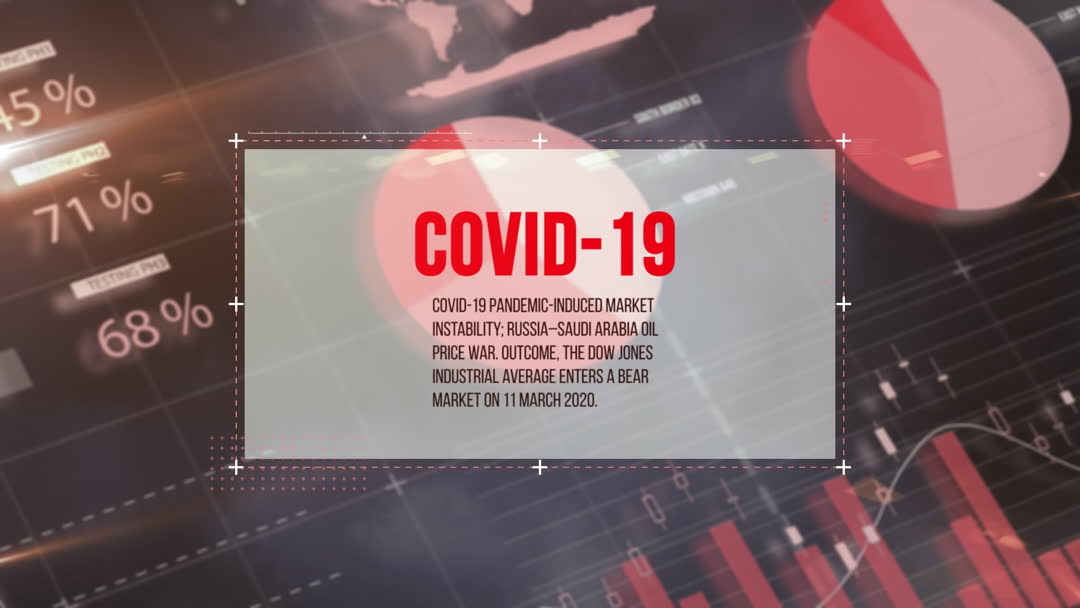 Visually represents the impact of the COVID-19 pandemic on global financial markets with animated statistics. Ideal for use in presentations, articles, and reports discussing market changes, economic instability, and analytical data during the crisis period.