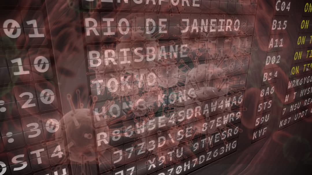 This composite video visually represents the significant impact of COVID-19 on global travel, emphasizing travel restrictions and disruptions through an airport information board interspersed with virus graphics. Ideal for use in articles or presentations discussing the pandemic's effects on the travel industry, international mobility challenges, or as an educational tool about pandemic responses and public health strategies.
