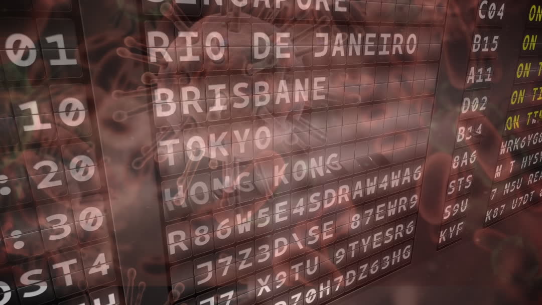 This video depicts the effect of the COVID-19 pandemic on global travel with an airport information board and visual representation of virus cells. It symbolizes the caution and uncertainty in travel during health crises. Ideal for use in articles discussing pandemic impacts on international travel, safety measures in airports, or the significant slowdown in global mobility. Useful for reports, blogs, and presentations on travel industry challenges.