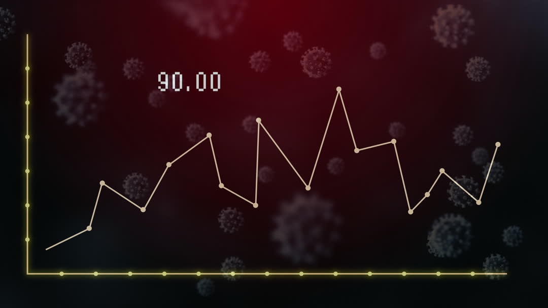 This visual blends Covid-19 virus videory with a graph showcasing changing statistics, ideal for use in presentations or articles on pandemic effects on businesses, health analyses or technology's role in pandemic response.