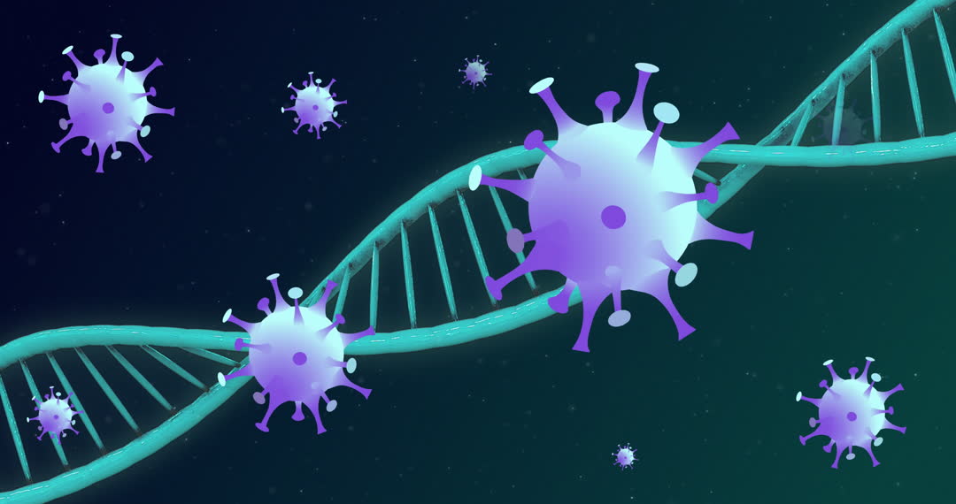 Illustration depicts Covid-19 virus cells interacting with DNA strands in a medical animation style. Useful for educational materials on the virus, science visuals, or pandemic-related healthcare presentations.