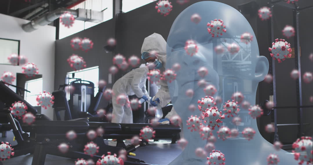 A digital illustration shows a worker in protective clothing sanitizing gym equipment, with COVID-19 virus cell visualization overlays. This highlights safety measures and hygiene practices during the pandemic. Suitable for articles on gym safety, health guidelines, pandemic measures, or fitness in a post-COVID world.