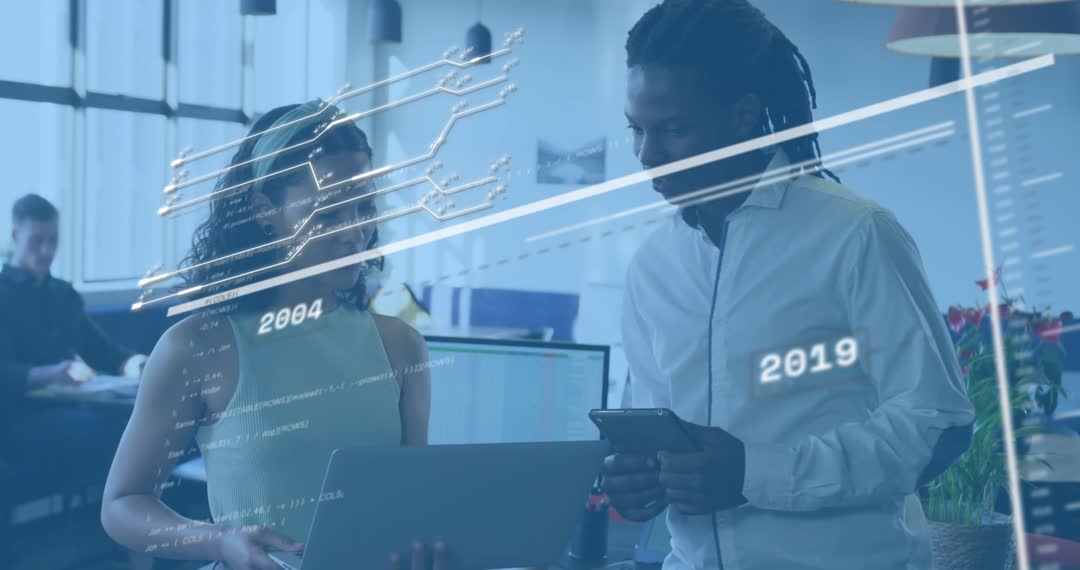 Coworkers collaborate by analyzing business data on digital devices in a modern office environment, showcasing teamwork and technological innovation. Graph overlays updating in real-time highlight progress and data-driven insights. Suitable for themes of business growth, technology development, teamwork, and modern communication dynamics.