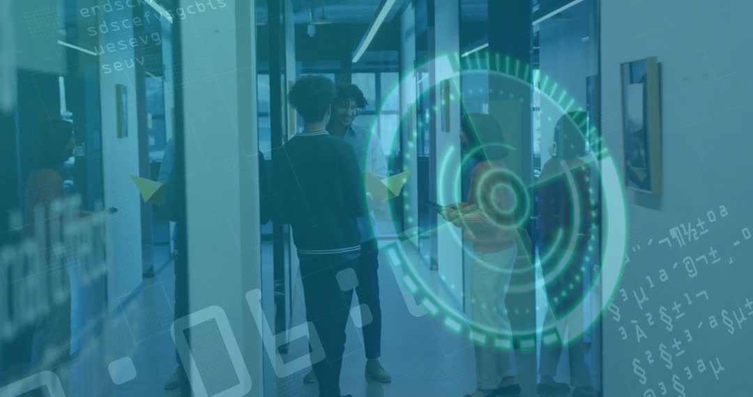 This video is ideal for illustrating modern work environments where technology and collaboration intersect. Perfect for content related to high-tech industries, innovative workspaces, or articles around digital transformation. The combination of human interaction and digital overlays communicates themes of teamwork and cutting-edge technology advancements.
