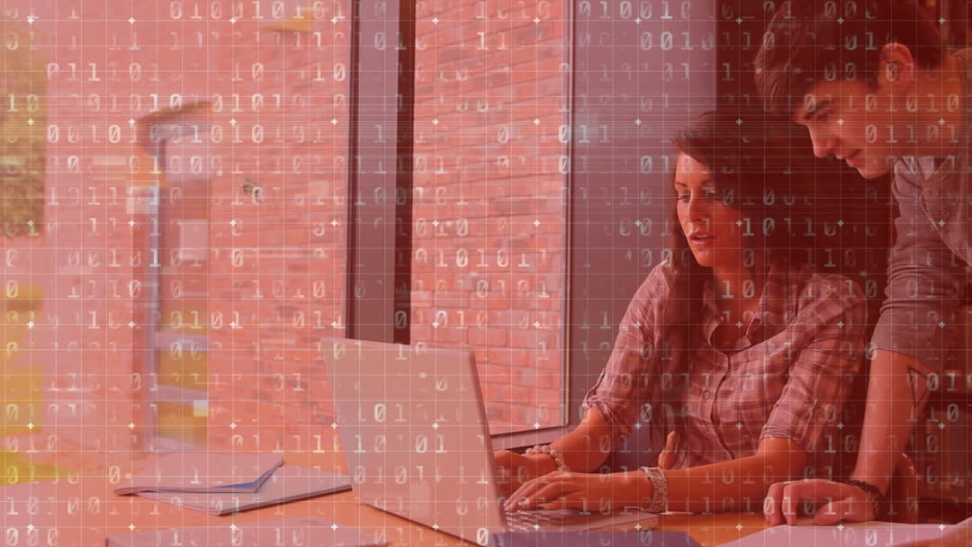 Binary code overlay symbolizes technology and coding concepts. Useful for illustrating teamwork in office environments, as well as marketing materials focused on digital innovation, software development, and information technology services.