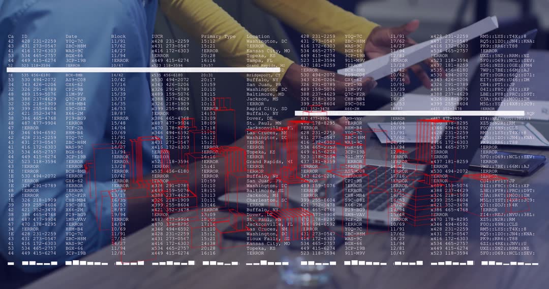 Employees collaborate and review documents in a contemporary office environment, enhanced by a digital glitch overlay illustrating data analysis. This mixture of real-world elements and digital information serves as a compelling visual motif for concepts of teamwork, modern business practices, and the intersection of technology and human error. Useful for illustrating themes around corporate teamwork, innovative data management, business growth strategies, and digital challenges in entrepreneurship.