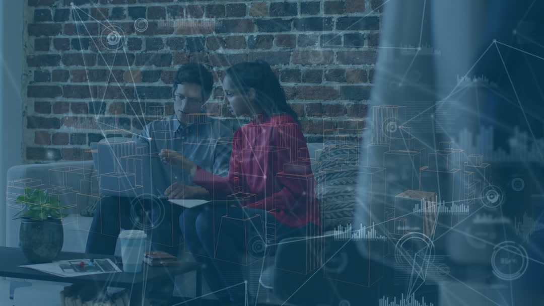 Coworkers Discussing Business Innovation with Digital Overlay Video