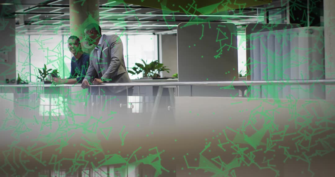 Coworkers having a conversation in a contemporary business atrium while a green digital overlay gradually fades, symbolizing innovation and new ideas. This can be used for presentations, business communication advertisements, teamwork promotion, and showcasing modern workplace collaboration.