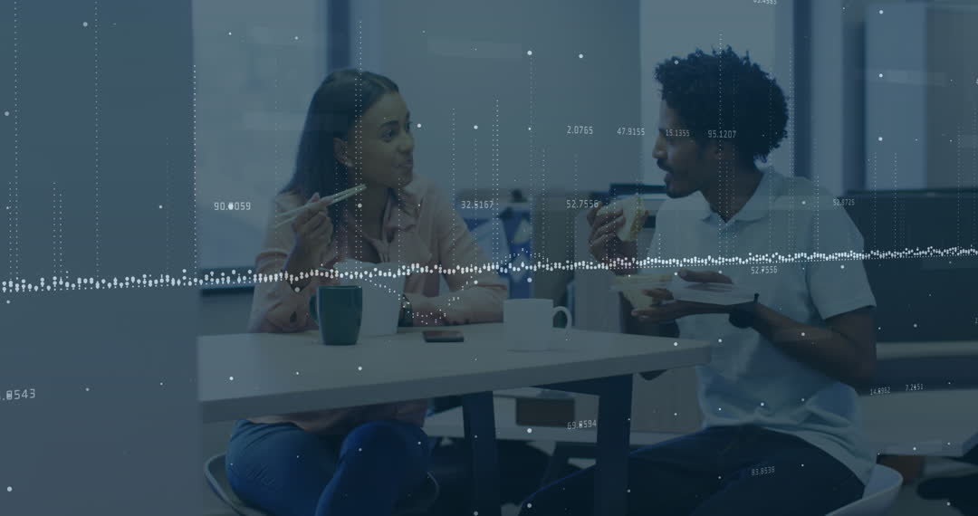 Diverse coworkers engaging in conversation while sharing food in a contemporary office space. The digital graph overlay signifies data analysis and growth, creating a dynamic blend of casual discussion and advanced business concepts. Useful for themes such as modern communication, data-driven strategies, or collaborative office environments.