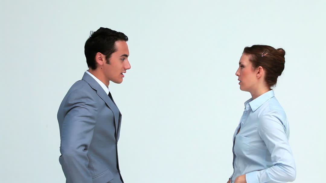 Business professionals shown engaging in a serious discussion. Ideal for illustrating interpersonal workplace communication or conflict in corporate environments. Useful in business training materials or HR content addressing conflict resolution.