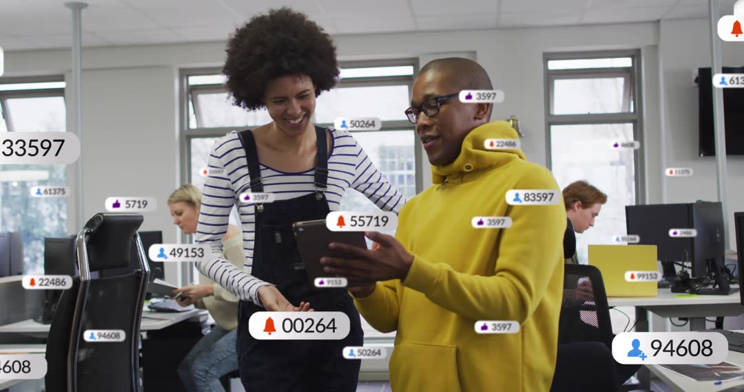 - Coworkers tapping tablet as notification badges and follower counts float through office
