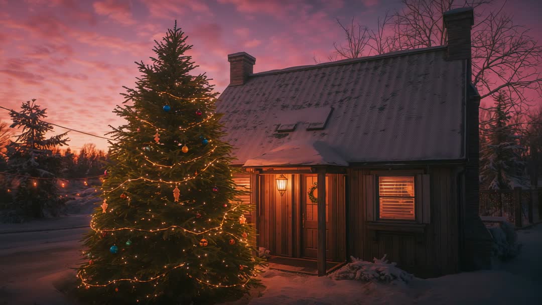 - Cozy Cabin and Illuminated Tree at Twilight in Snowy Landscape