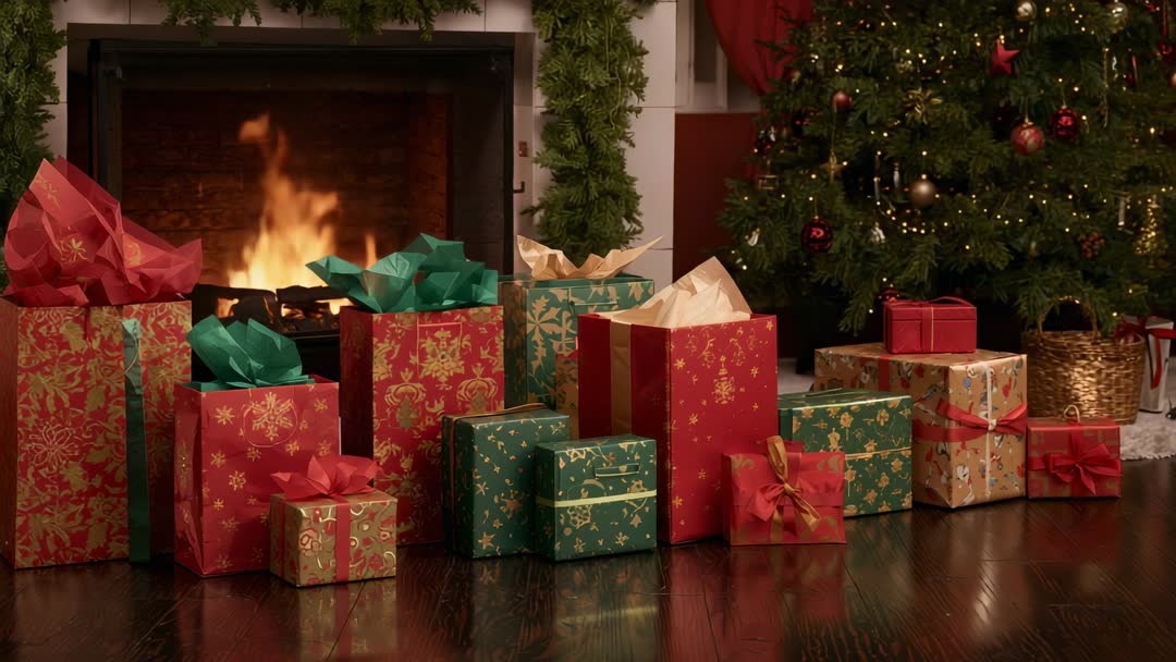 AI Generated Image. Video showing cozy living room with fireplace flickering and casting warm light across hardwood floor, wrapped presents glowing near hearth, Christmas tree twinkling with golden lights and ornaments, garland framing mantel. Camera focusing on foreground gifts with soft bokeh fire glow and tree lights in background, creating intimate and nostalgic holiday mood. Color palette using rich reds, greens, golds for classic festive look. Working well for holiday commercials, greeting cards, social media banners, website hero headers, email marketing, retail promotions, seasonal blog posts, gift guide content, lifestyle editorials, and store window digital displays. Supporting text overlays, logo placement, countdown animations, and product mockups while maintaining cozy atmosphere for family, home, and gift giving campaigns.