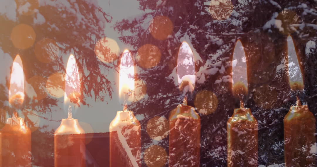 Image depicts an enchanting blend of glowing Christmas candles against snowy trees, creating a warm holiday mood. Ideal for festive greeting cards, winter-themed events, or Christmas promotions evoking rustic charm and cozy worship scenes.