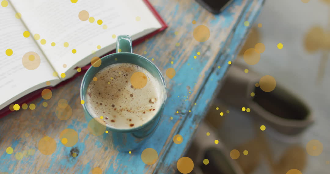 Cup of coffee on rustic wooden table with animated falling dots overlay, creating a warm and interactive effect. Ideal for relaxation themes, promoting coffee-related products, or digital and technology-focused content.