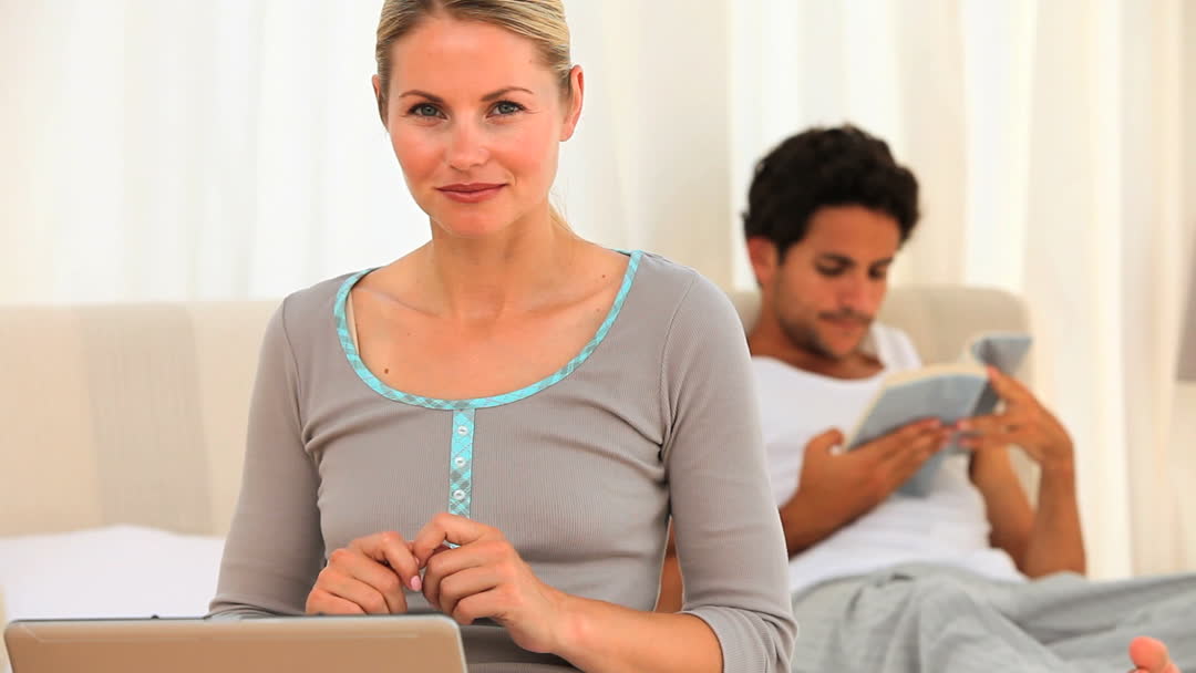 - Cozy Couple Relaxing with Laptop and Book in Bedroom