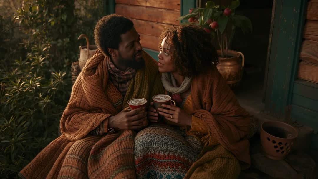 - Cozy Couple Sipping Lattes on Rustic Cabin Porch