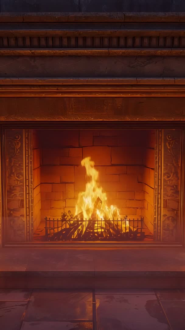 AI Generated Image. Featuring close-up view of burning logs moving on iron grate with flames flickering and embers glowing against carved stone mantel and tiled hearth. Vertical 9:16 composition optimized for mobile and social platforms. Warm orange tones and gentle motion creating intimate, cozy ambience ideal for holiday greetings, seasonal marketing, relaxation and meditation loops, hospitality backgrounds, store window displays, digital signage, screensavers, and social media stories. Loop-friendly footage providing seamless playback for long-form use. Color grading emphasizing warm highlights and soft shadows for cinematic mood. Serving as visual backdrop for winter campaigns, interior design presentations, romantic dinner overlays, fireplace scene in video edits, or wellness app relaxation features.