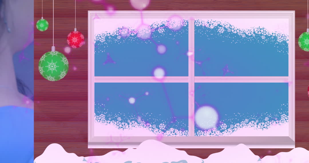 Scene shows a window decorated with holiday ornaments and snowflakes, conveying a feeling of warmth and festivity, suitable for winter-themed designs, Christmas advertisements, or holiday card backgrounds.