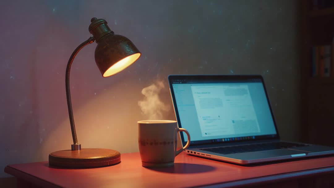 AI Generated Image. This video captures a tranquil home office setting featuring a steaming mug next to a laptop, illuminated by the warm glow of a desk lamp. Ideal for conveying themes of relaxation and comfort in professional settings, this file is suitable for use in articles or advertisements focusing on home offices, remote work, productivity, or creating a serene workplace environment.