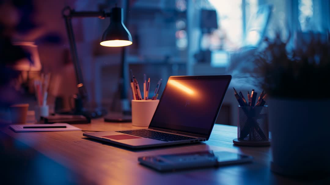 - Cozy Home Workspace with Illuminated Laptop and Lamp Light