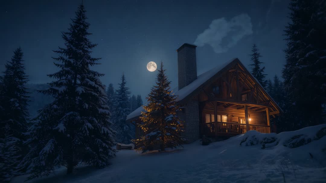 AI Generated Video. Video showing cozy log cabin glowing with warm porch light under full moon. Chimney sending slow smoke drifting on gentle breeze while pine tree nearby decorating with warm string lights. Snow blanketing ground and branches, stars sparkling in clear night sky. Camera slowly panning outward for atmospheric reveal, then holding on porch for intimate close-up of warm interior glow. Including crackling fire sound, soft wind, subtle footsteps in snow for added realism. Suiting holiday greeting videos, winter travel campaigns, mountain lodge marketing, real estate promos, seasonal social media content, cinematic openers, meditation and relaxation apps, virtual backgrounds for video calls and streaming. Recommending slow 24 fps, 4K resolution, warm color grading, loopable edit with gentle snowfall overlay and subtle camera dolly for cinematic feel. Including safe area for title and logo placement on top or bottom of frame for easy branding and captioning.