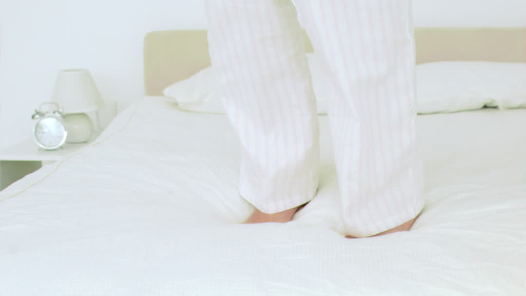 Person enjoying a playful morning, jumping on a white bed wearing pajamas. Captures casual and relaxed indoor lifestyle. Ideal for advertisements targeting home comfort, leisure activities, or strategies promoting bedding or sleepware products. Great as a background for home decor and interior design themes.