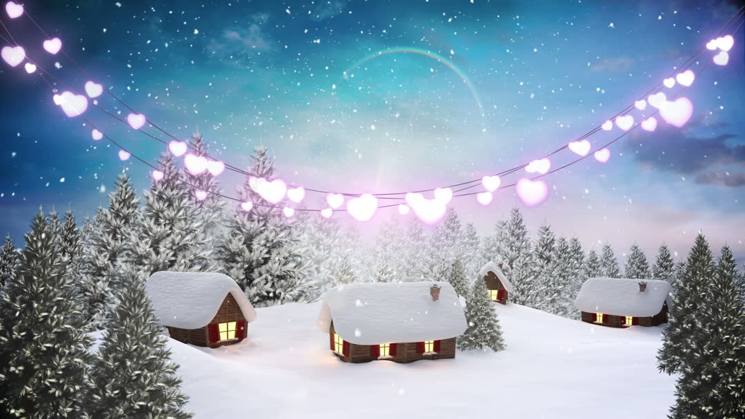 Idyllic winter landscape with cabins under gently falling snowflakes. Illuminated heart-shaped lights adorn scene, creating festive mood. Ideal for winter holiday greetings, celebratory event invitations, or romantic animated backgrounds.
