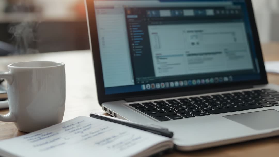 - Cozy Workspace with Laptop and Notes in Modern Office
