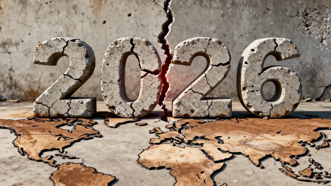- Cracking concrete numerals 2026 tearing world map as fissure widens with glowing core