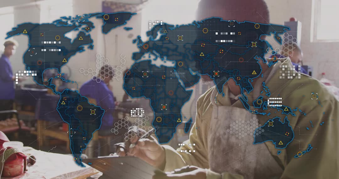 Video depicts craftsman marking board in vibrant garment workshop, merging traditional skills with modern technology overlay represented by a world map indicating network connectivity. Serves well for themes on global industry integration, technological advancement in craftsmanship, and collaboration in manufacturing processes.