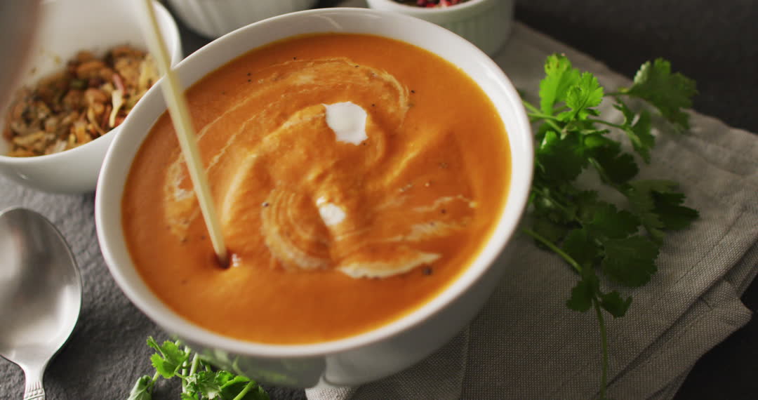 Shot captures vibrant blend of creamy soup poured into a warm bowl, garnished with herbs, making it ideal for culinary blogs, restaurant promotions, or food-based design projects. Emphasizes cozy dining experience and homemade cuisine appeal.