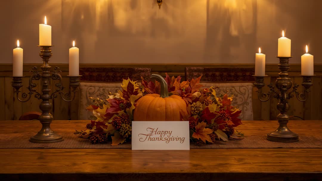 AI Generated Image. Featuring warm candlelight, pumpkin centerpiece, autumn foliage and Happy Thanksgiving card, creating cozy harvest atmosphere. Suitable for holiday marketing, seasonal social media posts, greeting card videos, restaurant and hotel promotions, website hero banners and event invitation backgrounds. Composition offering center space and lower-third area for overlay text or logo; candelabra providing symmetrical framing and candlelight creating soft shadows. Color palette combining warm oranges, deep reds and golden candle glow, matching rustic and vintage themes. Editing suggestions: applying slow pan or gentle zoom, looping subtle flicker, adding soft acoustic music or ambient fireplace sound for longer cuts. Use cases including enhancing menu designs, social ads, video greetings, in-store displays, table reservation pages, seasonal blog headers and email newsletters. Delivering intimate, elegant mood for Thanksgiving campaigns and seasonal storytelling.