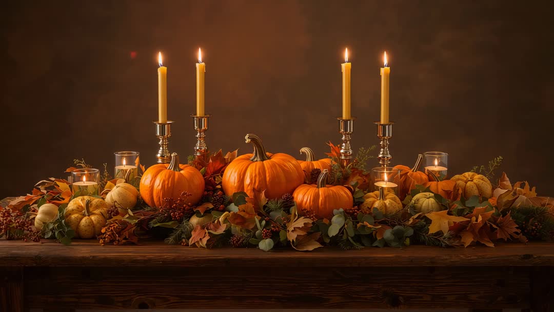 AI Generated Video. Showing slow cinematic pan across rustic fall centerpiece featuring pumpkins, gourds, autumn leaves, berries, and taper candles. Flickering candlelight casting warm amber glow across wooden table, creating cozy harvest mood. Camera focusing on candle flames and pumpkin textures, then pulling back for wide composition. Camera movement and shallow depth of field emphasizing tactile details and rich color palette. Working well for Thanksgiving commercials, seasonal marketing, home decor catalogs, restaurant promotions, event planning reels, social media shorts, blog headers, and greeting card animations. Suitable for background loop, product showcase, DIY centerpiece tutorial, interior design presentation, and mood-driven brand content. Color grading favoring rich oranges, deep greens, and warm browns, supporting festive and rustic visual identity.