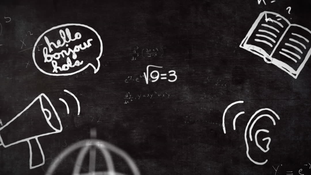 Visually striking background featuring math equations and communication symbols like a speech bubble with 'hello' in multiple languages and a megaphone. Suitable for education and language learning materials. Ideal for websites or presentations promoting diverse ways of communication and cross-disciplinary learning.