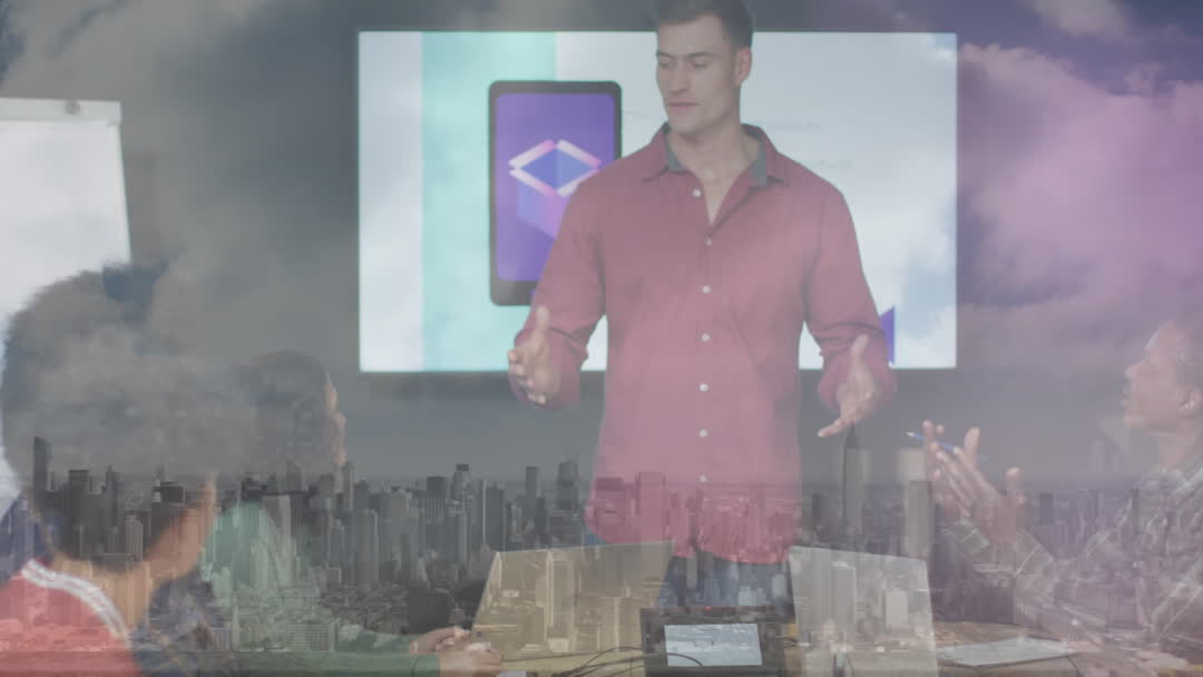 Creative Business Meeting with Cityscape Overlay Video