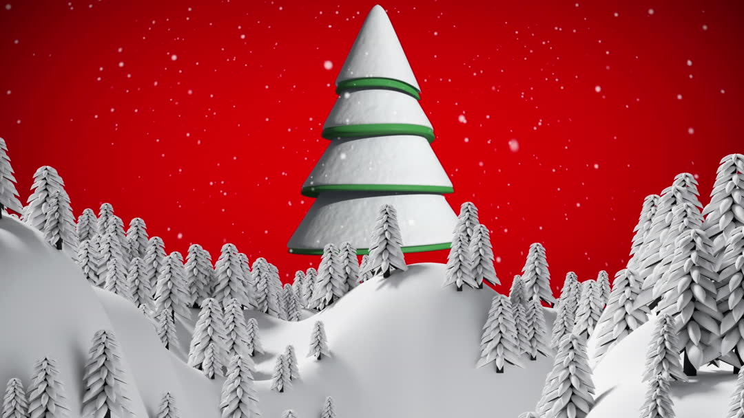 Festive winter landscape with animated Christmas trees and falling snow, set against a vibrant red background. Perfect for holiday greetings, festive promotions, and winter-themed digital content.