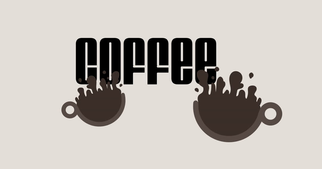 Illustration of bold coffee typography combined with animated coffee mug splashes. Ideal for use in cafes, coffee shop promotions, or graphic design projects related to beverages and caffeine promotions.