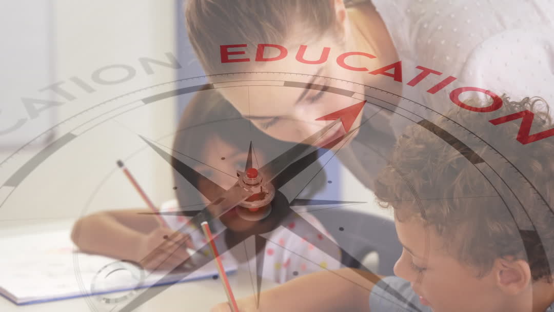 Animated visual featuring diverse schoolchildren receiving guidance from a teacher, combined with an overlay of a compass indicating the global nature of education. Useful for depicting educational themes, digital learning platforms, and promoting inclusive education approaches.