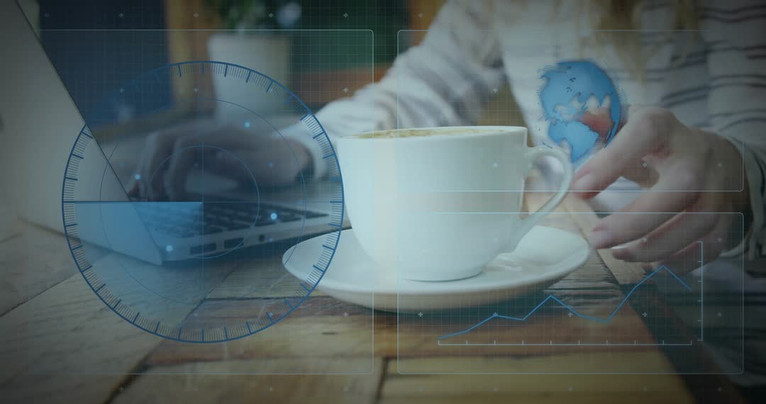 Video showcases hands typing overlaid with dynamic data visualization graphics, including a globe and graph animations. Designed to represent modern technology in remote work settings. Useful for illustrating themes of innovation, efficiency, and technological advancement in business environments. Ideal for presentations on digital transformation and tech-driven workspaces.