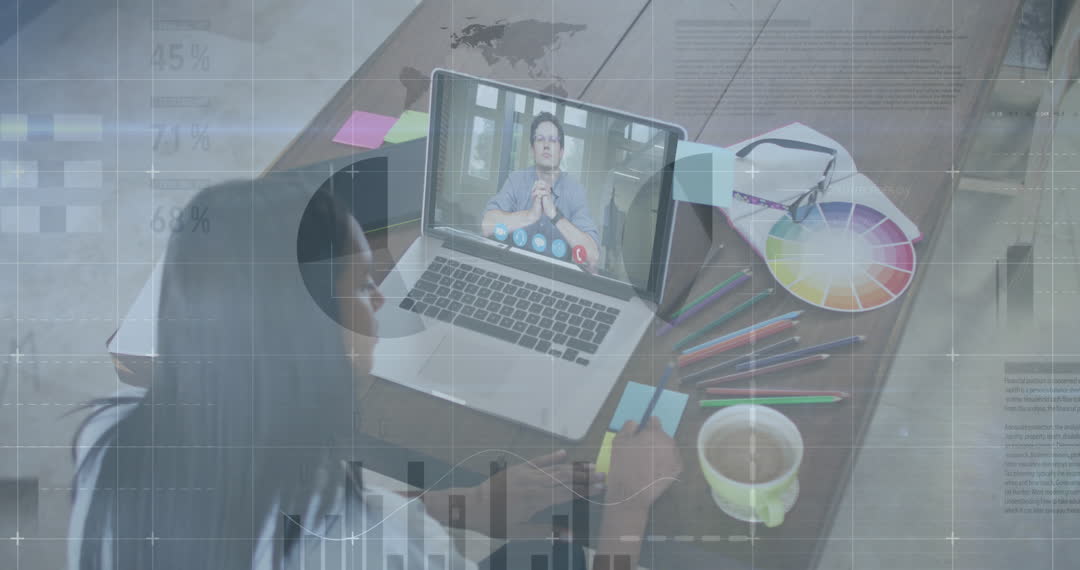 African American female designer engaging in a video call on a laptop surrounded by colorful stationery and coffee. Overlaid financial graphs indicate the fusion of creativity and business in a remote work setting. Ideal for concepts of virtual workspaces, digital communication readiness, and financial strategy in creative environments.
