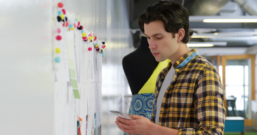 Young Caucasian male designer in modern office carefully selecting colors from board. Can be used for depicting creative processes in fashion industry, professional work environments, or consulting services focusing on design collaboration and individuality.