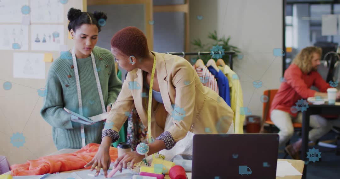 Two fashion designers collaborate, discussing fabric samples in a lively design studio. One shows focus analyzing measurements while the other takes notes, signifying recent fashion trends or brainstorming new collections. Ideal for depicting teamwork, creative processes in innovation-focused industries, fashion tips, skilled artisans, and artistic collaborations aiming for authentic design production.