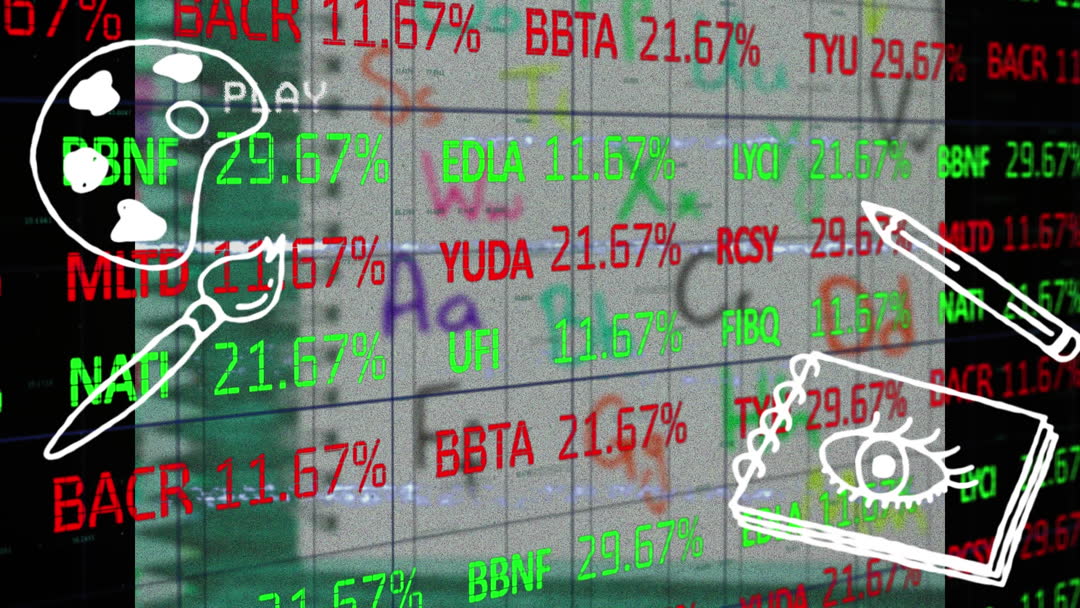 Creative Financial Data Analysis with Graphic Symbols Overlay Video