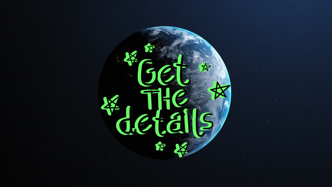 Illustration displays earth in space accompanied by phrase 'Get the Details' accented by stars. Useful for social media campaigns, creative digital storytelling, or presentations emphasizing a global theme.