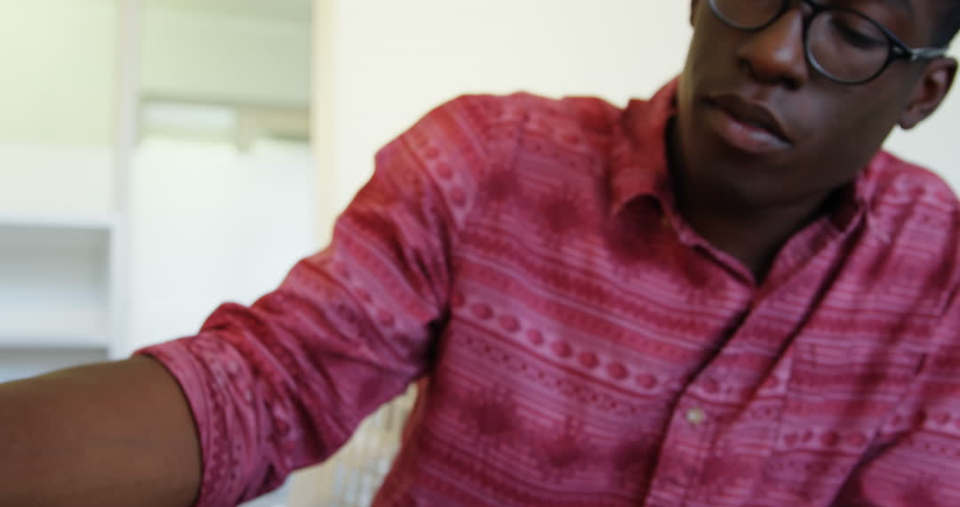 An African American male graphic designer is immersed in his work, using a graphic tablet in a modern office setting. The atmosphere is one of focus and creativity, ideal for project-based freelancers or remote workers. This video is perfect for illustrating concepts related to creative work environments, productivity, diversity in the tech industry, and remote working solutions.